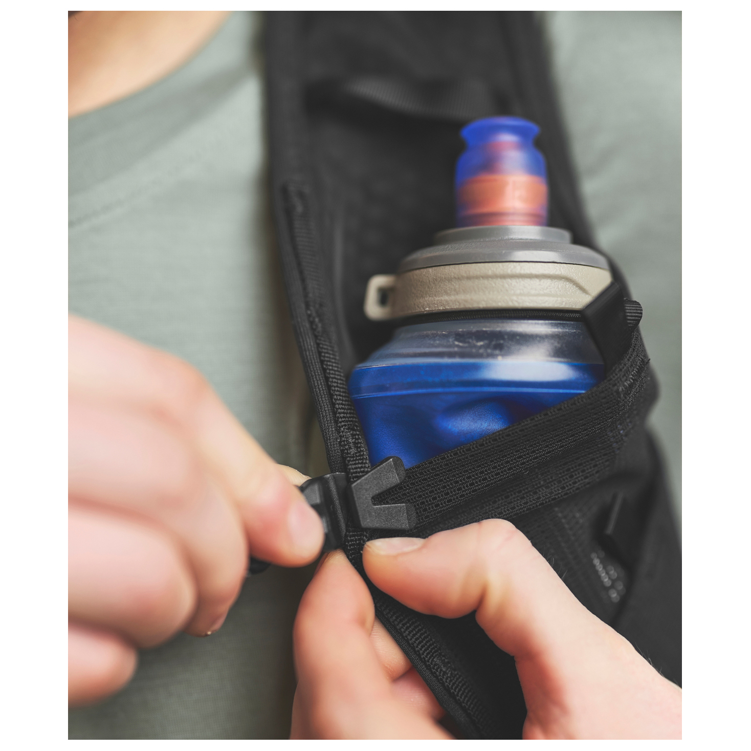 - vaellussauvojen kiinnittimet, pullonpidike, vetoketjullinen etutasku