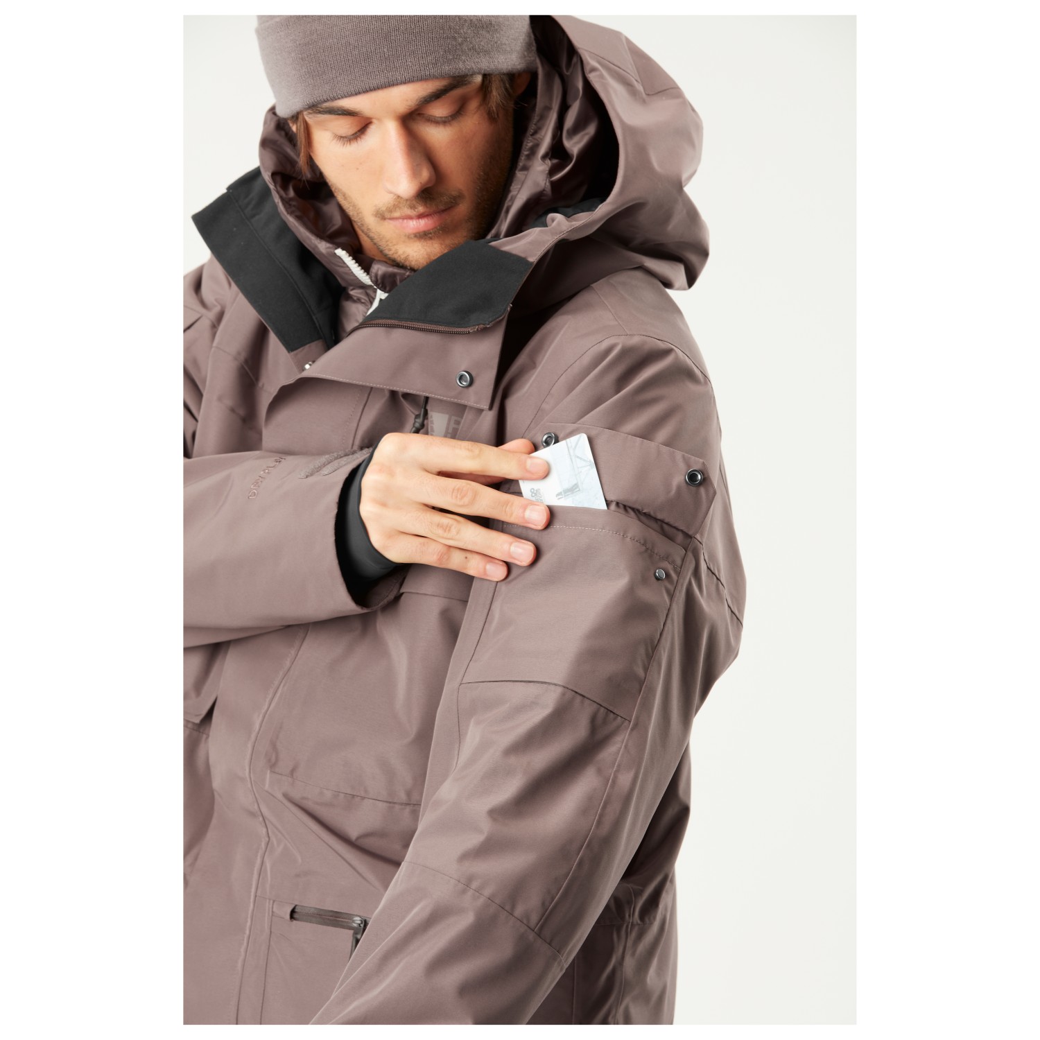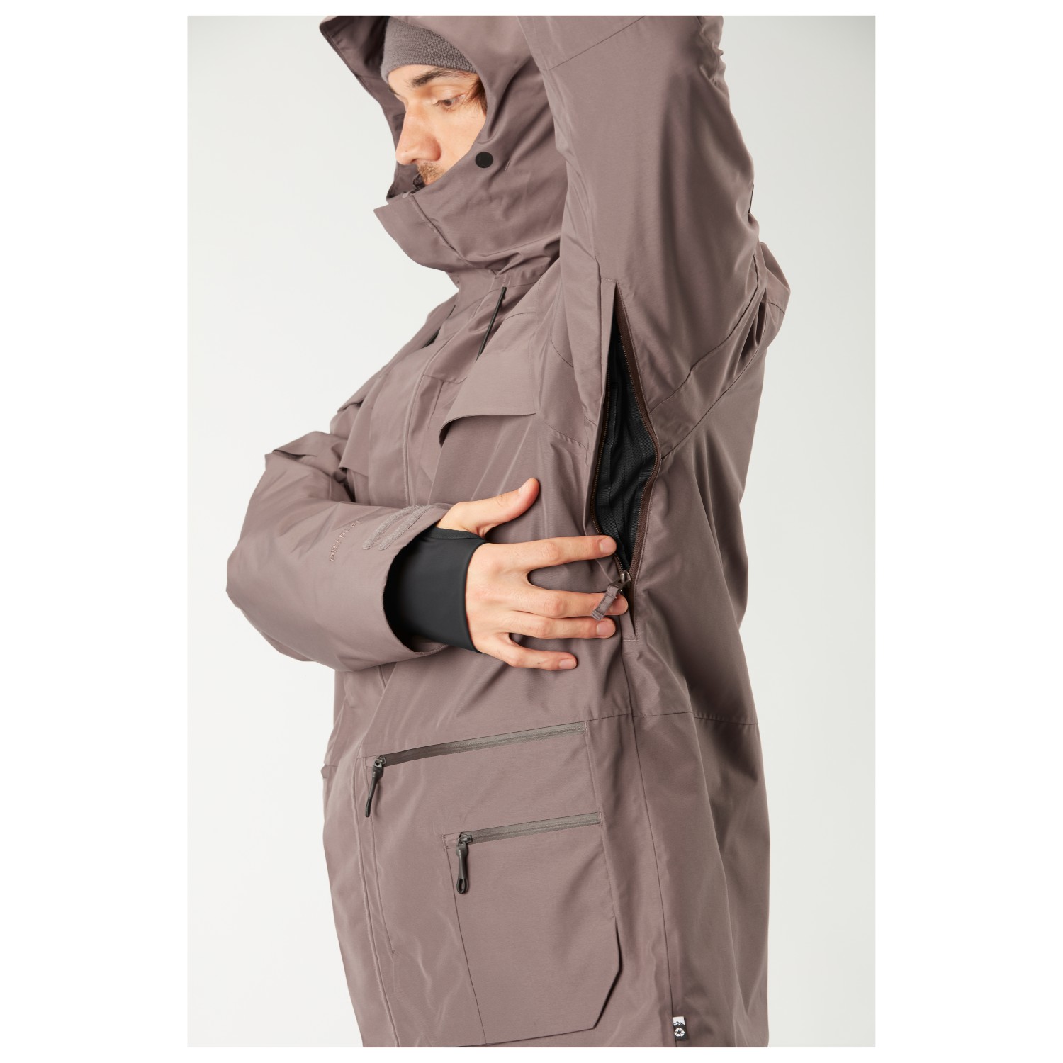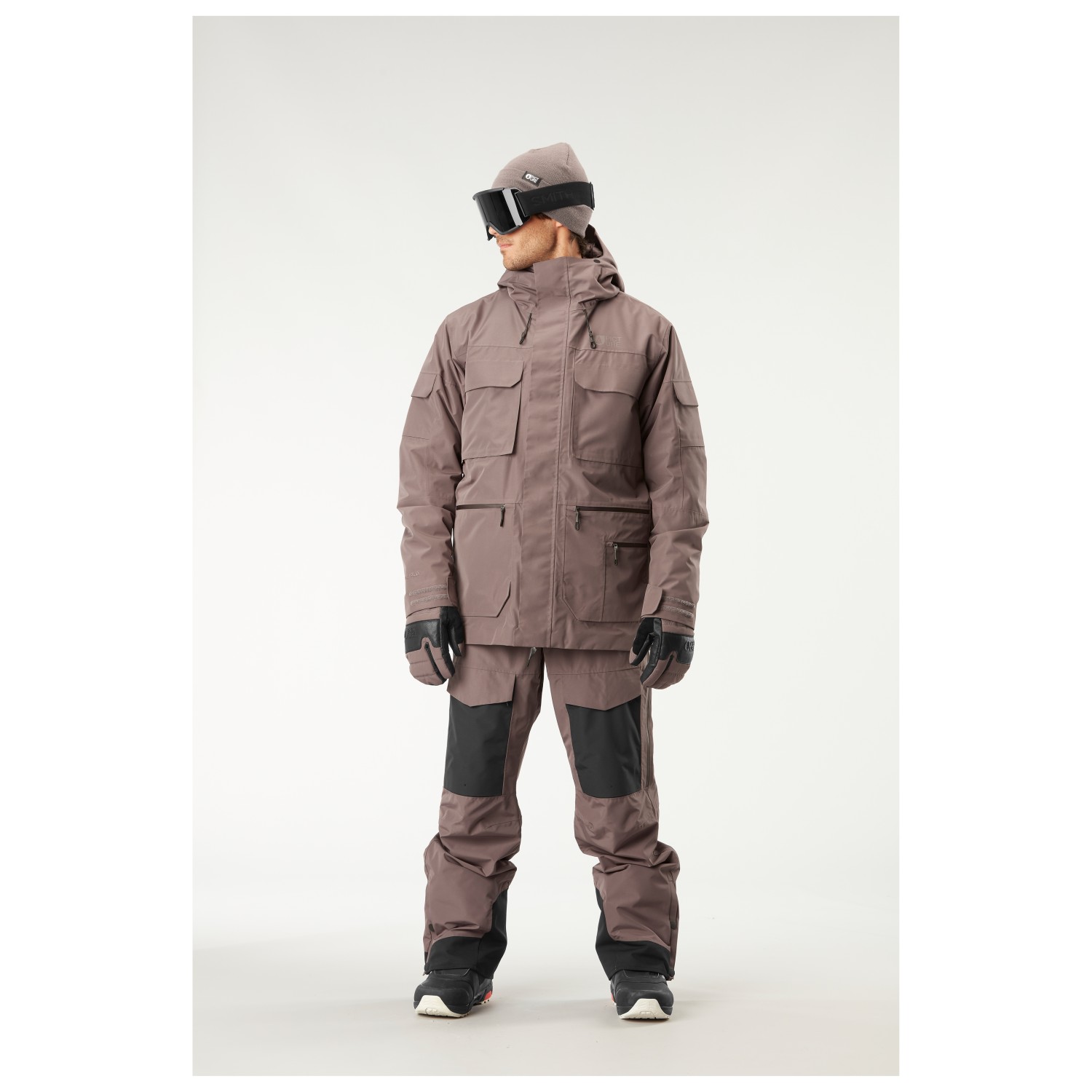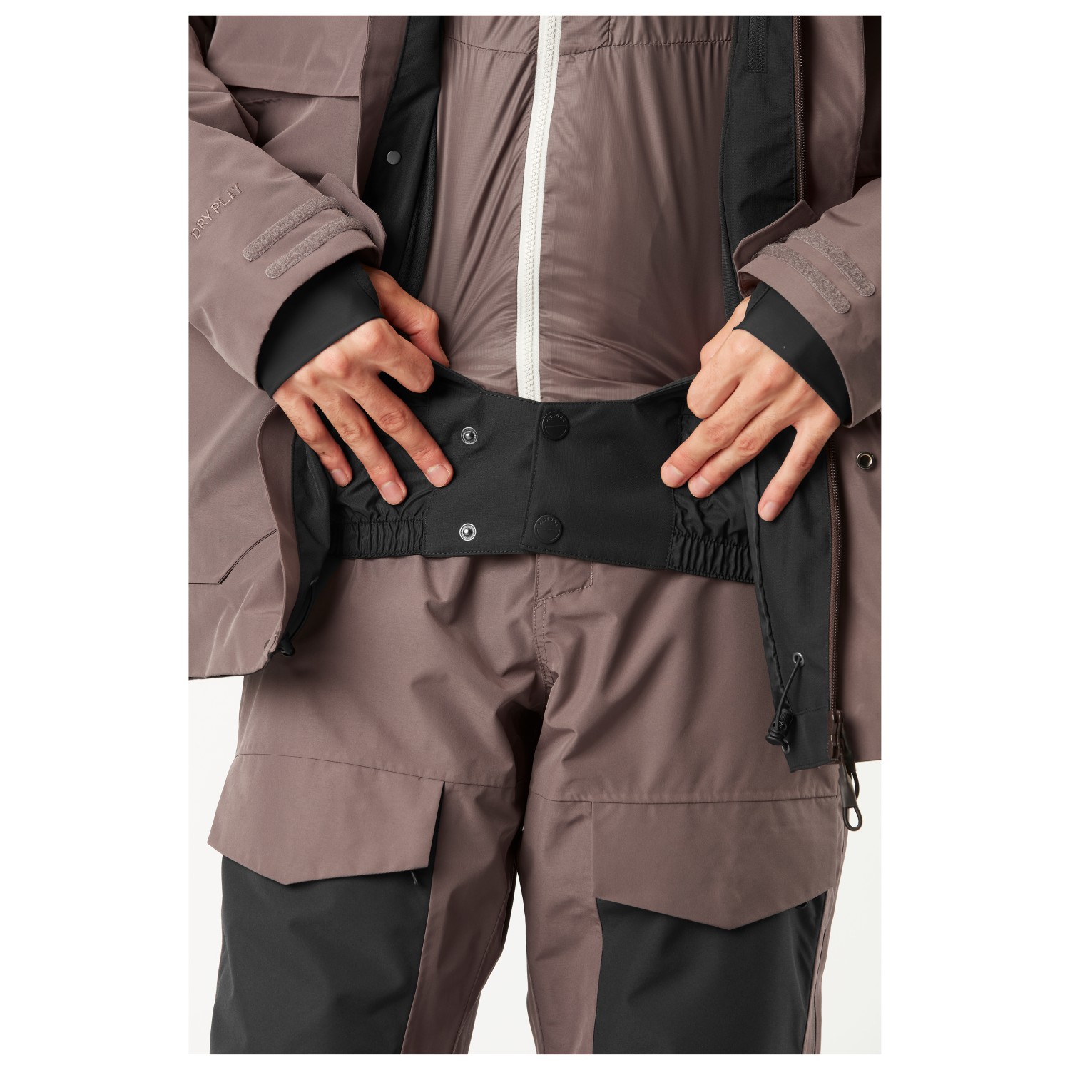- Takki ja housut yhdistettävissä, kiinteä lasinpuhdistusliina, Saumanyöri, Suojukset hihansuussa, peukaloreikä, irrotettava lumilukko